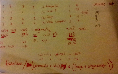 Now as I mentioned in my post on Hero bonuses seeming smaller than expected, the game works primarily with additive bonuses, leading to diminishing returns the more bonuses are applied. However when it comes to troop training speeds, the bonuses from the Barracks buildings and the rest (Forge/Siege Weapons/Hero) are separated and work multiplicative! (Note that this makes sense: If everything was additive, the Siege Weapons research and Forge levels would be absolutely useless compared to many 100’s of percents bonus from all your barracks!) I found this out the hard way with some back-of-the-napkin calculations for various situations: