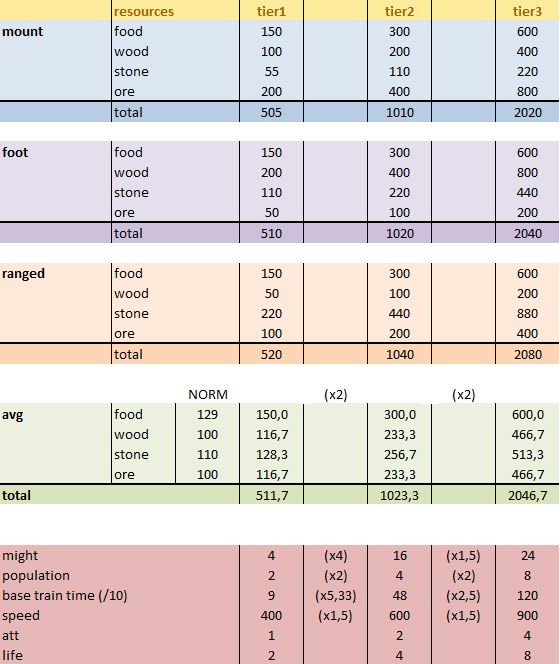 The below three charts show Might of all three Tiers plotted against Build-time, Attack power and per 100 Resources needed. Please note that the Build-time graph is relative, denoted by the (r): (100 food should be 100 Rss)