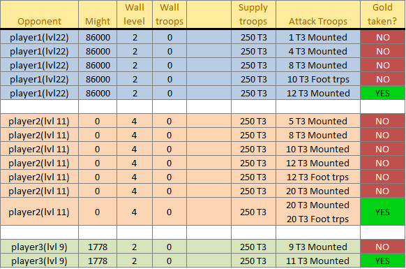 What I found however, was that the number of attack troops needed to take the gold varied between players. I does not really matter, but I dont like not understanding game mechanics π , so here is the data: