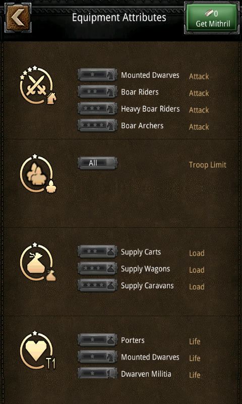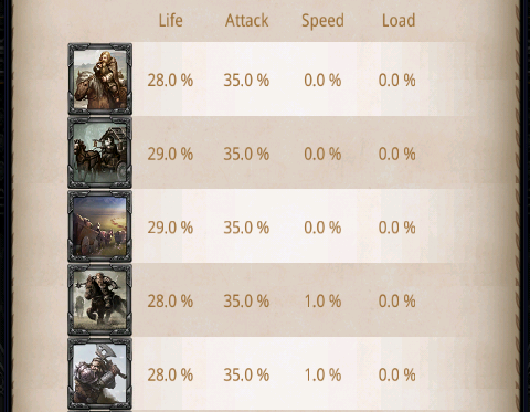 The details screen again gives an overview of the bonuses of your hero and his equipment, but this time lists them per unit in the game. From top to bottom are listed all units in all 5 Tiers, from left to right the percentages bonus to Attack, Life, Speed, and Load capacity.