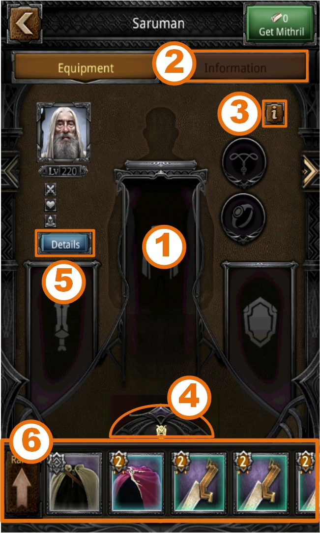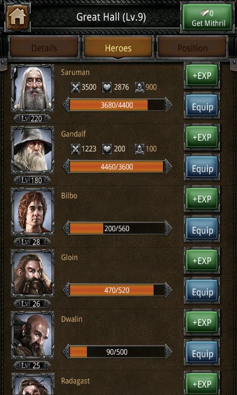 It is also in this screen you see for the first time a summary of the bonuses per Hero, given by all the equipment that Hero is currently wearing, like my Gandalf and Saruman to the right.