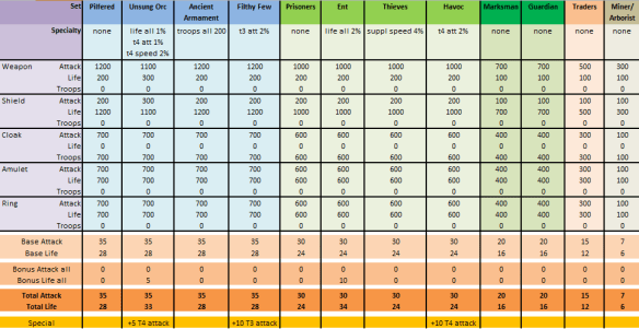 I also found a Cursed Watcher’s Shiv from the goblin caverns. 700 attack, 100 life. 2% life (sup wags, ents, bat rams, m. gladhrim), 2% life (sup car, eagles, mith guards, galadrim lancers), 2% life (el rangers, riders of riven, galadrim archers, sup columns) & 2% -foe attack (all troops). Green color & req hero 60.
