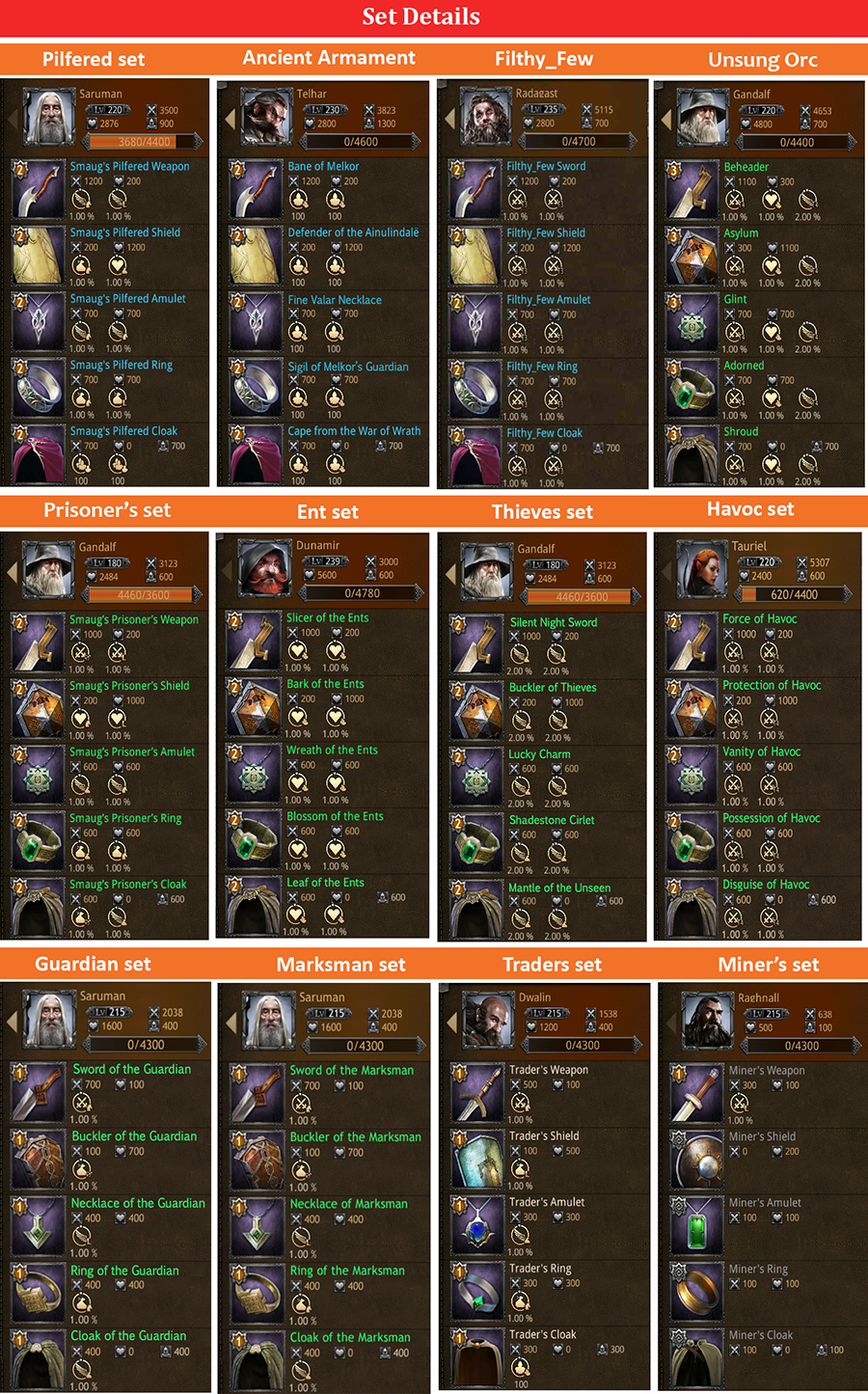 I’ve put the recently released hero specific gears here as they do not seem to be part of a full set. Basically, these are legendary items that can be bought in sage tower for Orc ears, which drop in temporary campaign maps and can be bought every now and then in chests. They can be wielded by any hero, but sometimes bestow specific heroes with extra bonuses. Right now, the bonuses seem to be increased TT march sizes only though.