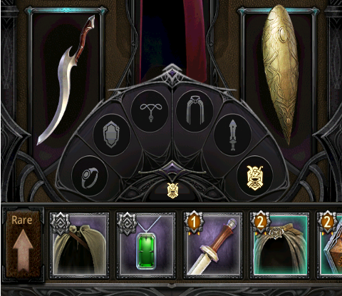 When you press the golden button above the item bar, the inventory select menu is brought up. Here you can narrow down which type of item is displayed in the item bar, by pressing one of the 6 icons in the menu. From left to right, the item types are: Rings, shields, amulets, cloaks, weapons and “all” (default).