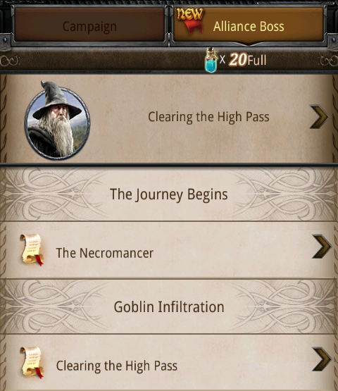 The campaign boss battles is somewhat of a mystery, but from the description it seems you will be able to battle powerful and recognizable enemies from the movies with other alliance members, a sort of instance/dungeon like idea such as WoW perhaps? It is still unavailable at the moment, so it is difficult to tel what it will be like exactly..Is now available and is described in this post. It can be found in the normal campaign screen: (also note the slight change in aesthetics here, which are more profound when pressing an actual level)