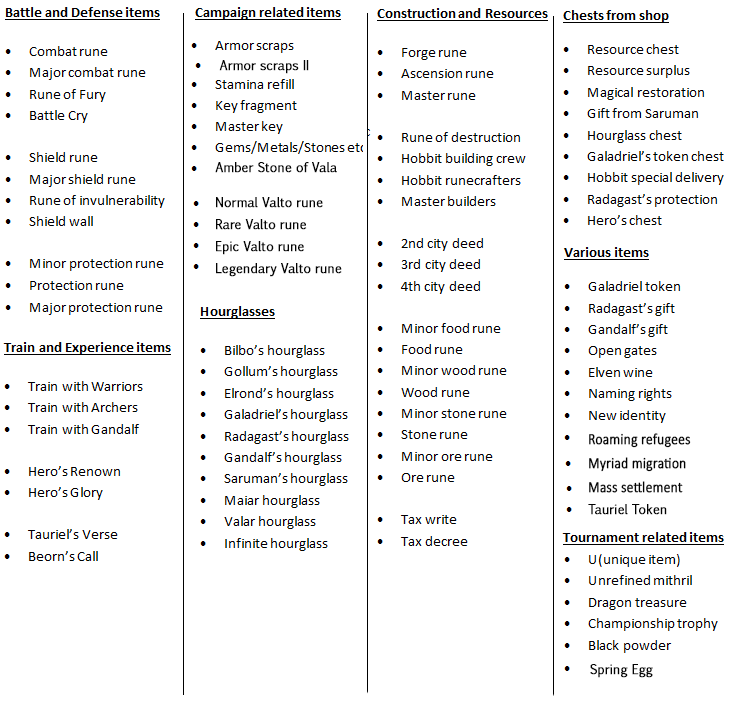 articleheaderAnother addition to the beginners articles; in this article are listed virtually ALL in-game items you will encounter playing Kingdoms of Middle Earth. From chests, to Hero’s Glory, and from Hobbit building crew to Rune of Fury, this list gives an extensive overview of the items you use in the game, what they do exactly, and what they cost if you want to buy them in the shop (provided of course the item is for sale). Items are listed in the categories: Battle, XP, Campaign, Hourglasses, Chests, Construction and Resources, Tournaments and Various . Hop on in!