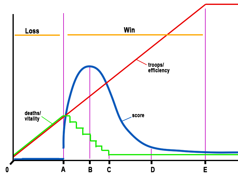 Between 0 and A, troop numbers increase, but you are sending insufficient troops to defeat the goblins. The deaths graph is the same as the troops graph, and up to point A, you get a zero or no score.