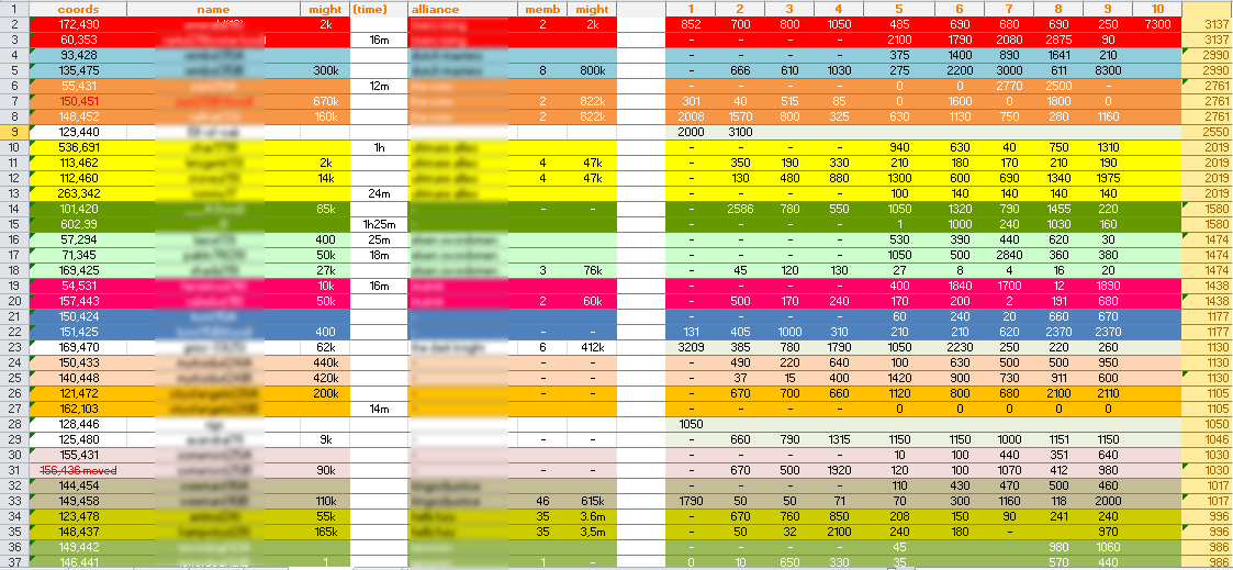 So in my case, the above shown map is accompanied by a farm list. I actually do not use the map anymore to be honest. What you keep track of of your farms is up to the individual, but I did/do it quite extensively. I noted down coords, name, alliance, level, might and resources gained for a number of farming trips, but if you want less work, just strip it to name, coords and rss gained. The list looks as follows: