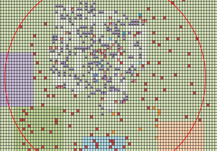 This was just for me personally to make sure I covered every angle around my cities, and didn’t miss certain patches. I attacked players that fit my “farm preference” and noted them down. I even went so far as to make a small map in Excel (below) which showed me immediately where my farms were (or potential farms). Purple dots were initial farms, red dots after I expended my farming routines. Whether you want to do this yourself I’ll leave up to you, it at least helped me figure out which areas I hadn’t covered yet.