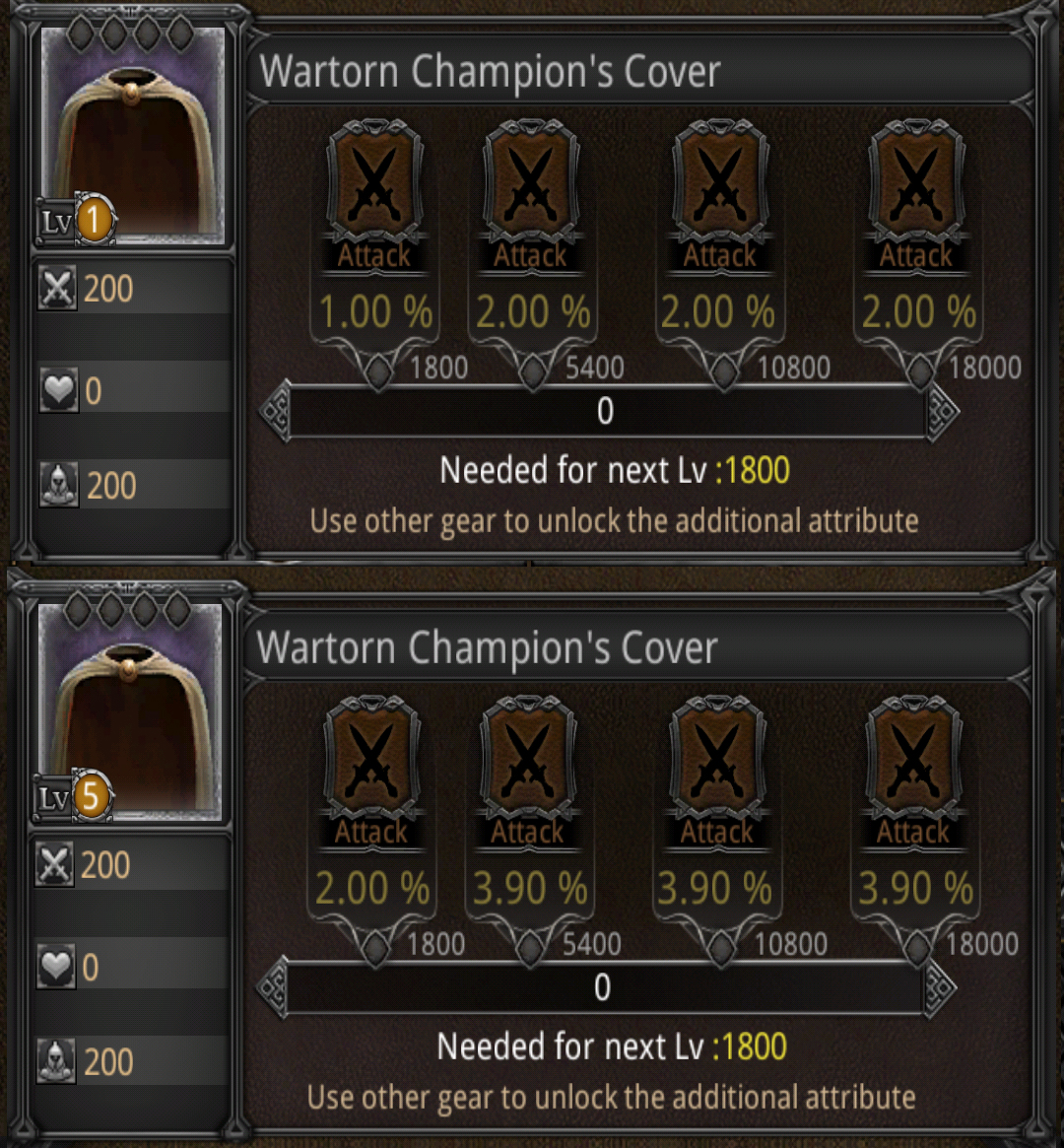 The answer is yes, if you fully enhance a piece of high lv gear (Wartorn can be powerfull fully unlocked and at lv10, but is looked at as a piece less powerful than most of all other gear, hence it is easier to upgrade it). So back to high lv gear pieces. I want you to take 2 identical pieces of Arcane gear, lets say the sword, and for the 1st one, enhance it to unlock all bonuses when it still is at lv 1. Now go to the second piece not fully unlocked @ lv1 and upgrade it to lv10, and as ur doing it write down how many of which valto runes u used total and how many runes u used on each lv up. I 100% GUARANTEE, when you u go to lv up the 1st piece of gear (That we fully unlocked all bonuses and @ lv1) and do the same writing down how many runes used per successful lv upgrade and the total # of runes used to get the piece to lv10, YOU WILL SEE WHAT IM talking about. lv1-4 upgrades might be the same but when u get higher to lv5-lv10 it becomes almost impossible to get a successful lv upgrade esp when u get to lv7 & lv8.