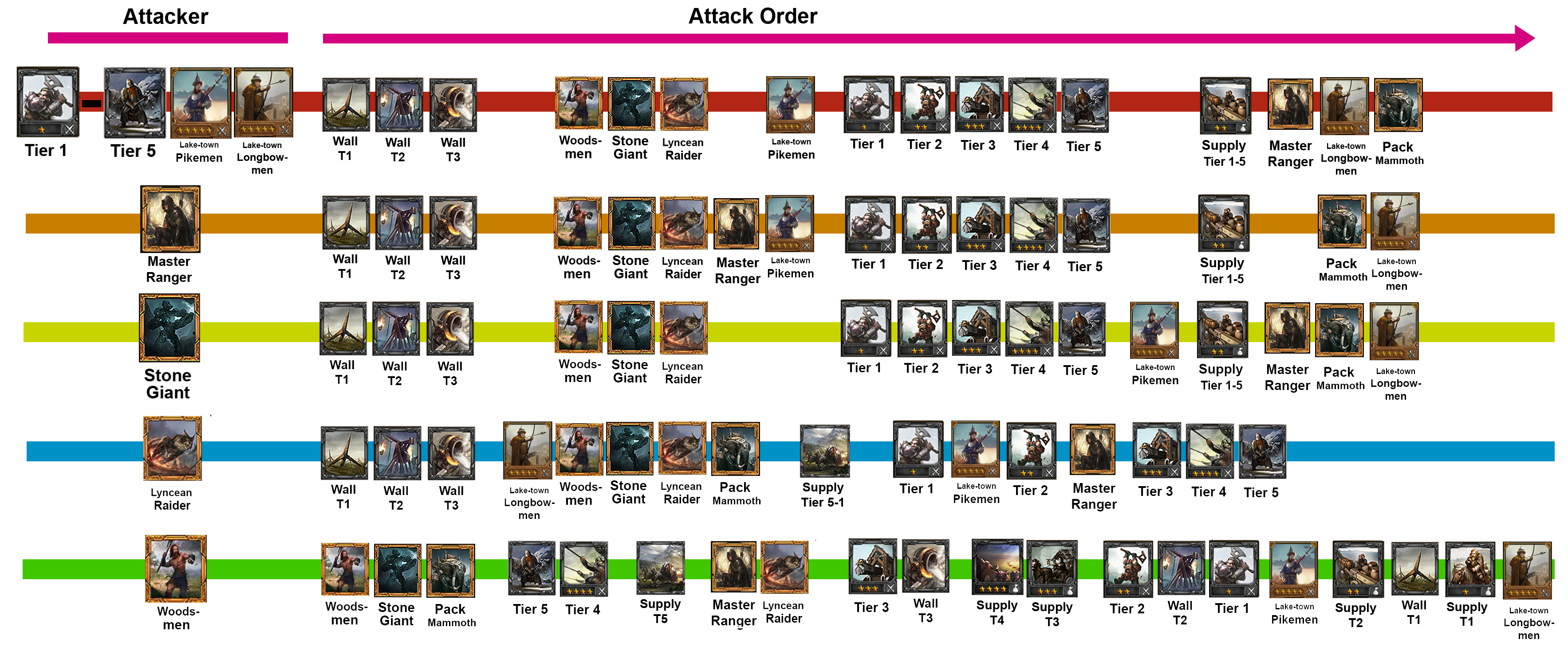 Below are given the complete attack orders for all troops. I made an graphic overview, but for people who prefer text, it is given in text form at the bottom as well. The information given here is vital in TK competitions, both for attacking or for defending your city. You can have all the T1 in the world, but Woodsmen completely ignore that and go straight for your Giants and Mammoths. Conversely, Mammoths can be used as a meat shield to protect against massive Woodmen attacks. Whatever the case, use this information to your advantage when attacking or defending your own troops!