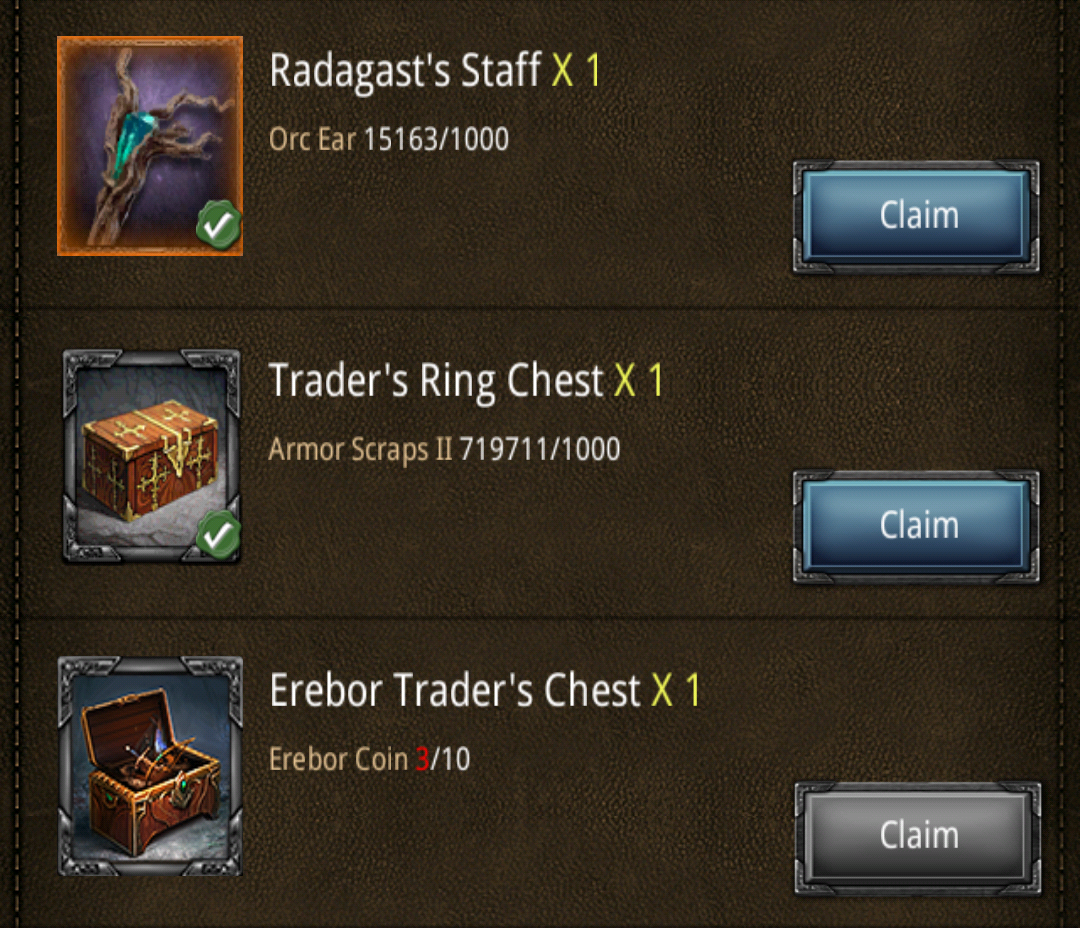Lastly, Erebor Coins farmed from Smaug in campaign can be traded in for Erebor Traders Chests, which can be opened to reveal one of the 3 regular Smaug chests. 10 Coins can be traded for one chest.