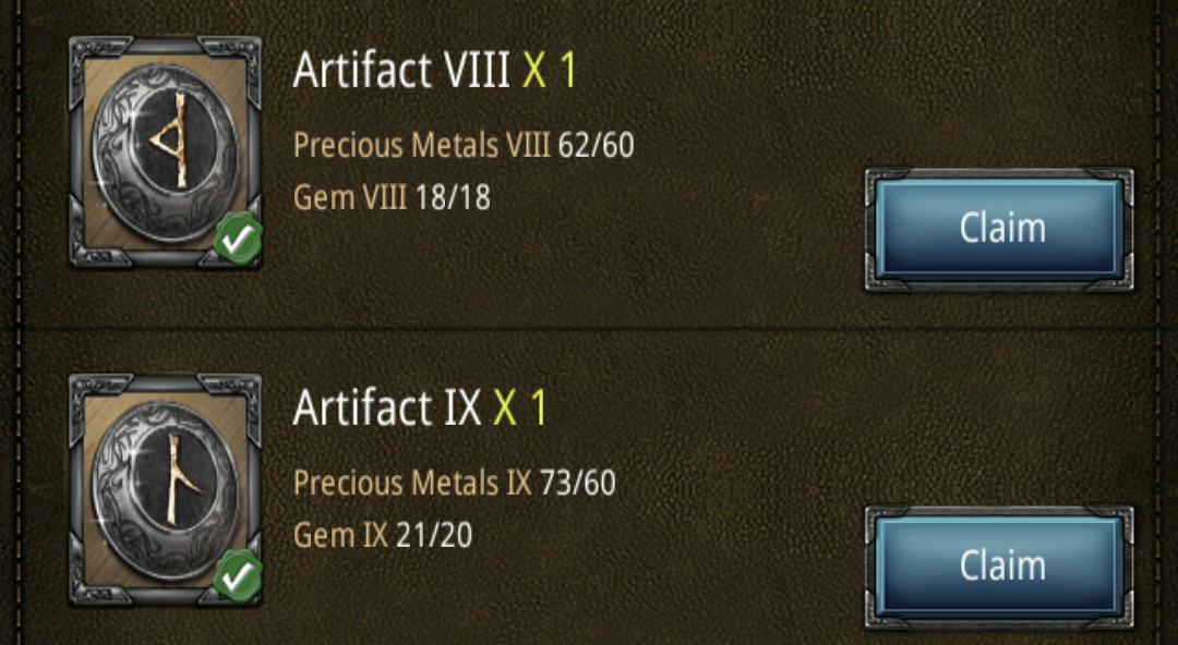 These buffs can be upgraded with Artifacts traded in the Sage Tower. Materials for these are Precious metals, stones and gems farmed from campaign maps Mirkwood, High Pass and Moria. Under the category Attack and defense you can find the trades for Relics I to X to upgrade your Guardian’s Attack and Defense buffs: Ferocity and Resilience.