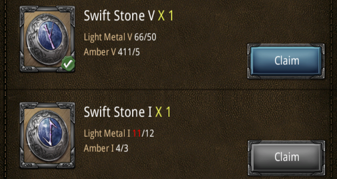 Similar to the Attack and Life category, the Training Speed category offers trades for Swift Stone relics which increase the troop training speeds for the City in which the Guardian stands to which they are applied. The Light Metal and Amber materials are farmed from Mirkwood campaign map. Unlike Attack and defense, this category only knows 5 levels.