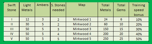 Light Metals and Ambers I through V drop from the corresponding parts one the Mirkwood campaign map. As with Metals and Gems, the Light Metals drop from the normal maps per part, while the Ambers are farmed from the Boss levels. Metals drop more often than Ambers, but more Metals are also needed per Swift Stone, such that the required amounts of Ambers and Light Metals take roughly the same time to farm.
