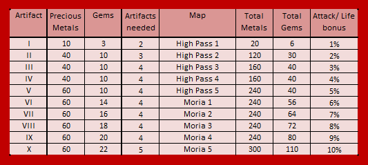 Materials for Artifact I to V drop from parts 1 to 5 in High Pass campaign map, while metals and gems for Artifact VI through X drop from parts 1(VI) to 5(X) in Moria. Each map part drops materials for the corresponding Artifact. Metals drop from normal maps, while Gems drop from the Boss levels. Metals drop more often than Gems, but more of them are needed per Artifact. For the first 6 Artifacts, Metal drops in 2 or 4 stacks, but this drops to single drops in later parts of Moria.