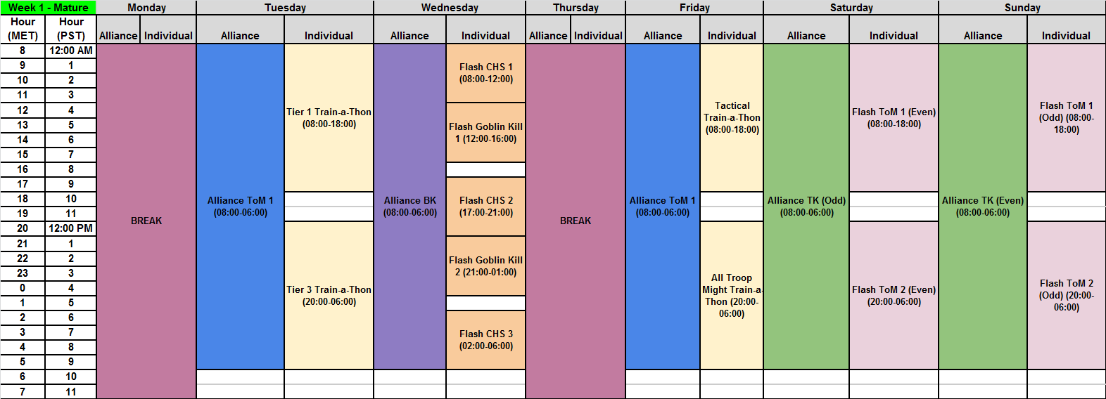 Schedules will be released for the tournaments, but currently only the schedule for week 1 has been released. Other schedules will follow when they are released as well.