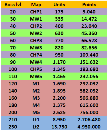 Of importance to note is the fact that a Boss does NOT need to be killed completely to give points, rather you get points for every Goblin killed. Killing half the Goblin forces will net the Alliance half the maximum points directly, instead of at the moment the Boss is killed completely. Below are the maximum scores for each Alliance Boss in ascending order, and color coded per campaign map: