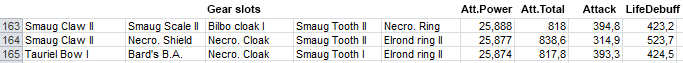 Are you actually assuming that every gear has a perfect 4. buff? If yes: How do you define perfect? Did you use a Tauriel Bow 2 with +36% att or -36% life for your statistics?