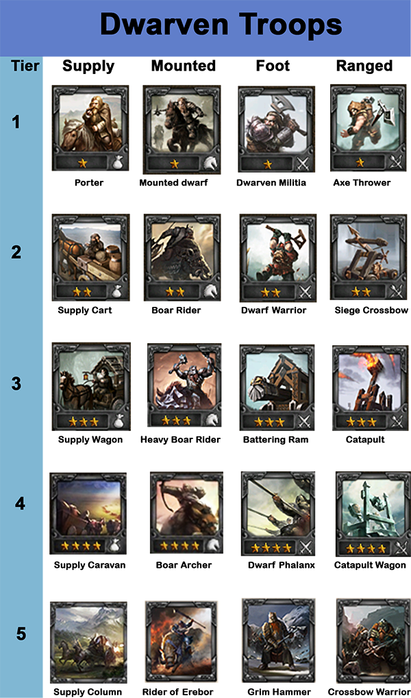 For new players, it might be difficult to recognize all troops that are available in the game. What troops are what Tier and what do the troops of the other faction look like? Below are two images which contain all currently available troops for both the Dwarven and Elven race, Tier 1 to 5. Time to keep these warriors apart (click for larger version):