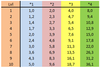 The four Tiers (marked *1-*4 in KABAM emails) start out at 1%, 2%, 4% and 8% bonus respectively, but can grow to considerable amounts if you happen to be lucky enough to get gear at level 10! Use this as a reference for determining end-game gear specs, or whatever you like :). Thanks to QuietschEnte  for confirming the numbers!