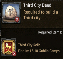 Finally after waiting long enough, not only have Third cities been enabled on our server, but relics started dropping from Goblin camps 6-10, giving players who do not spend money on the game or who did not win a 3rd City deed already a chance to farm the relics themselves.